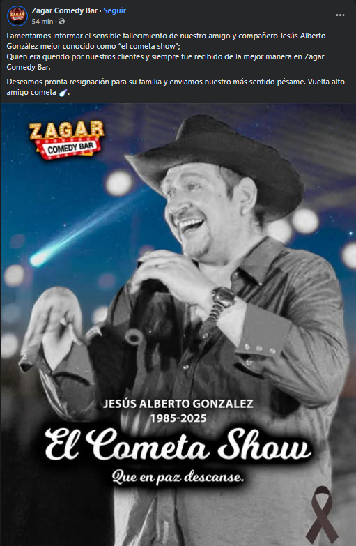 El gremio de la comedia en Nuevo León se encuentra de luto tras confirmarse el fallecimiento de Jesús Alberto González, mejor conocido como “El Cometa Show”, figura querida en los escenarios regiomontanos y parte fundamental del ambiente humorístico del norte del país.