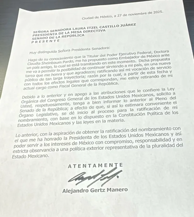 En su carta de renuncia, Gertz Manero informó que la decisión responde a una invitación del Gobierno de México para asumir una embajada en un “país amigo”, argumento que presentó como causa grave, tal como lo contempla la Ley Orgánica de la FGR para permitir la separación del cargo antes de concluir el periodo.