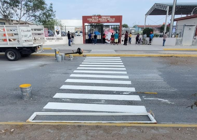 El Alcalde Carlos Peña Ortiz continúa impulsando acciones para proteger a la población escolar en Reynosa. Este lunes 9 de marzo se realizaron trabajos de pintado de cruces peatonales frente a la escuela primaria Rosalba Francisca González Morales, ubicada en la calle Rosario número 305 del fraccionamiento Lomas del Real de Jarachina Norte.