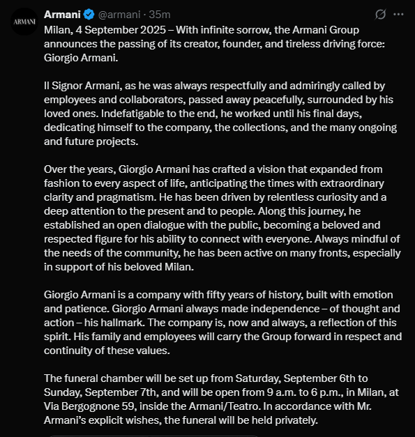 El gobierno italiano, así como personalidades del arte, la cultura y la política, expresaron condolencias y destacaron a Armani como un símbolo de la excelencia italiana. En Milán se organizará una capilla ardiente para que el público rinda homenaje, seguida de una ceremonia privada.