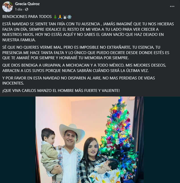 La creadora de contenido Grecia Quiroz compartió un mensaje cargado de emotividad durante las celebraciones decembrinas, al referirse a lo que describió como una “Navidad fría”, marcada por la ausencia de Carlos Manzo. A través de sus redes sociales, Quiroz expresó sentimientos de nostalgia y tristeza, dejando ver que este cierre de año estuvo acompañado por un vacío personal significativo.